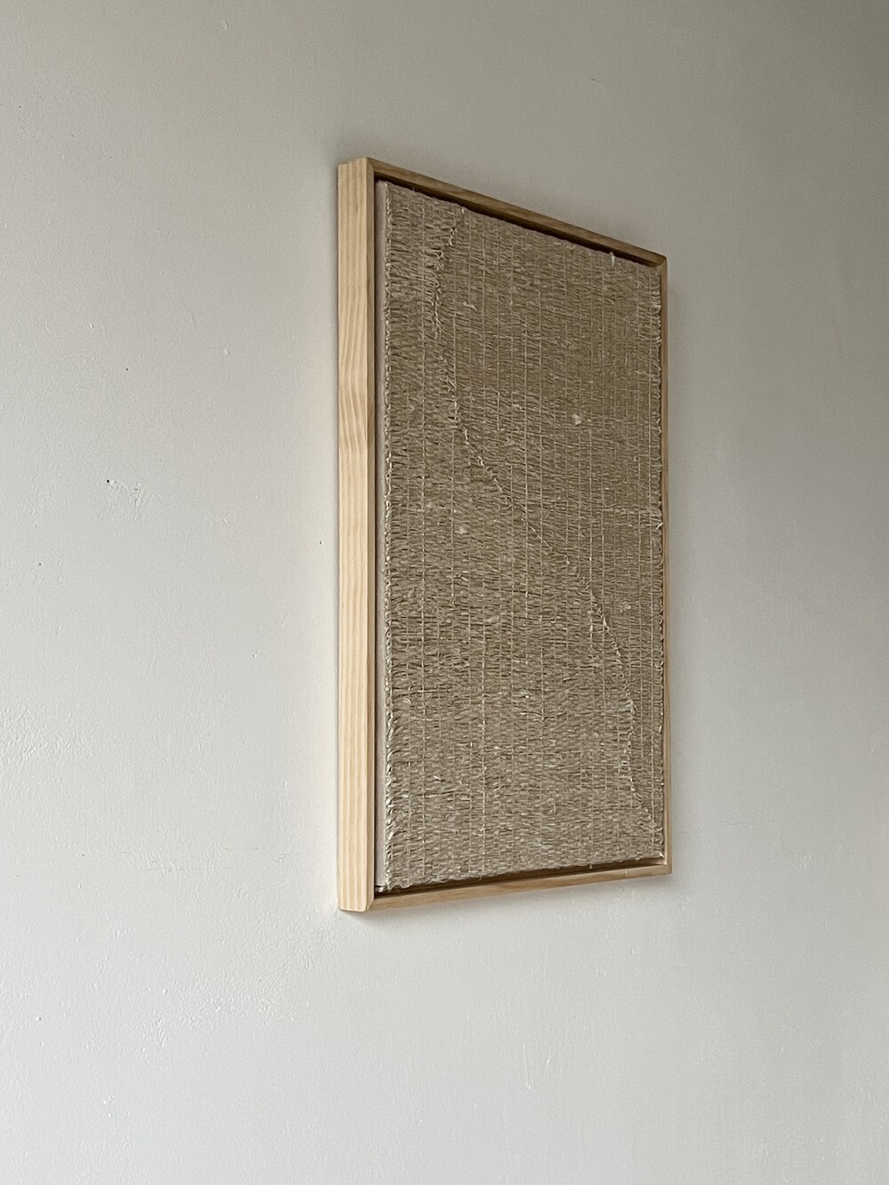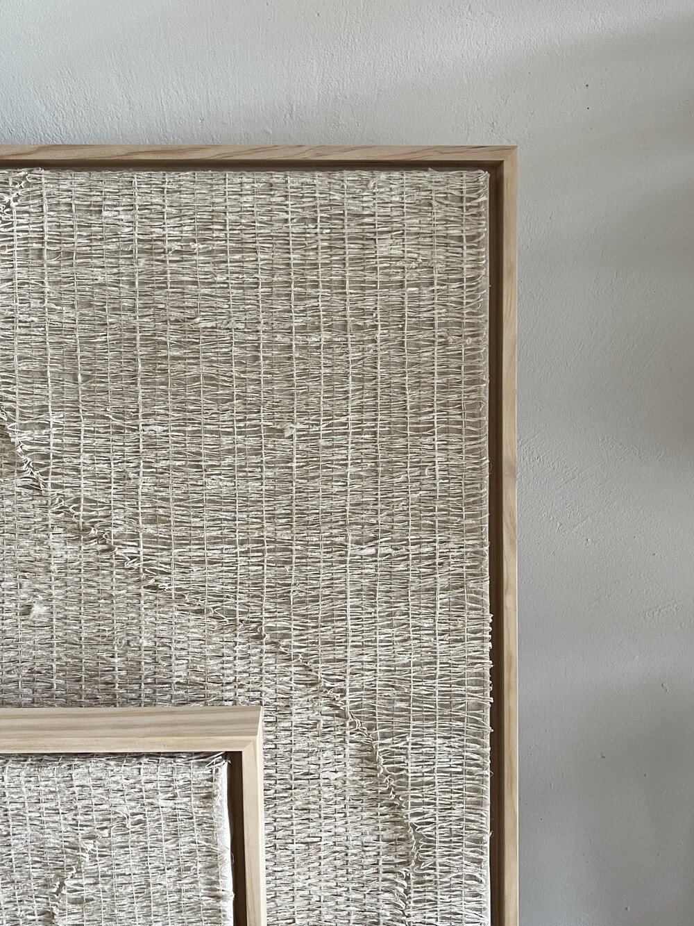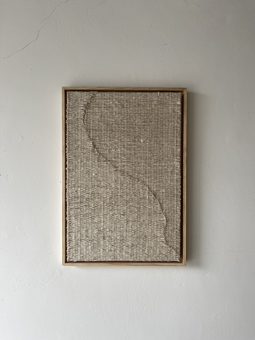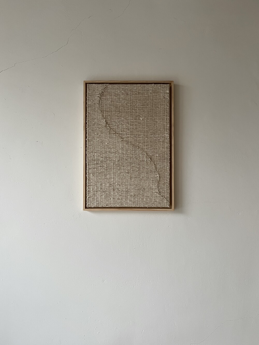 작업 과정 중, 선을 어떻게 표현할지에 대해 고민이 많았습니다. 여러 표현 방식을 시도했지만, 불필요한 요소들을 잘 덜어내어 간결하게 표현하는 것에 집중하였습니다. 작품을 볼 때 시선에 걸리는 부분이 없었으면 하여, 짜임의 밀도 차이로 자연스럽게 나뉘는 경계를 선으로 표현하였습니다. 빛과 각도에 따라 달라지는 선의 선명함과 텍스처의 깊이 또한 이 작업을 바라보는 또 하나의 요소가 되길 바랍니다.
