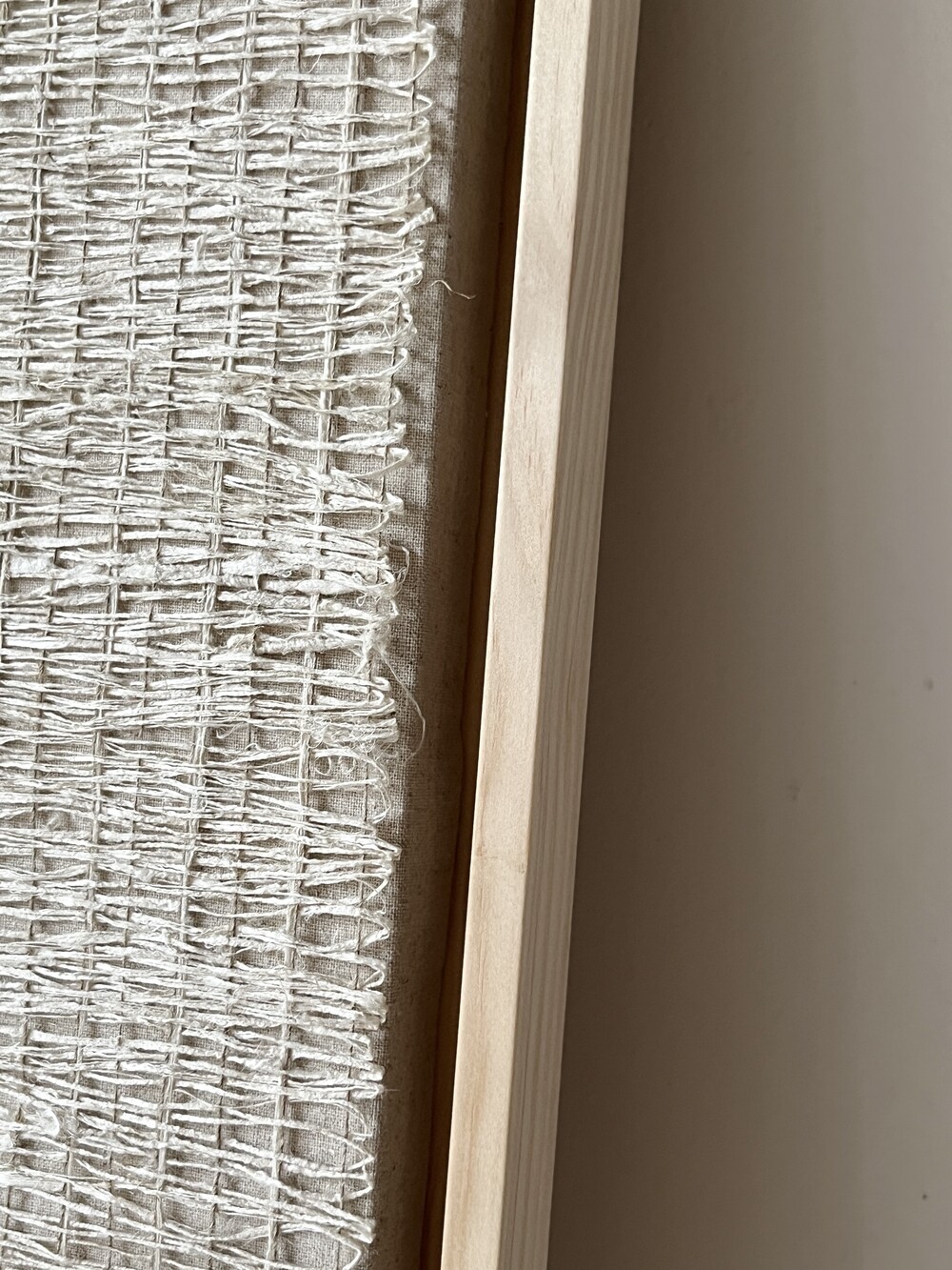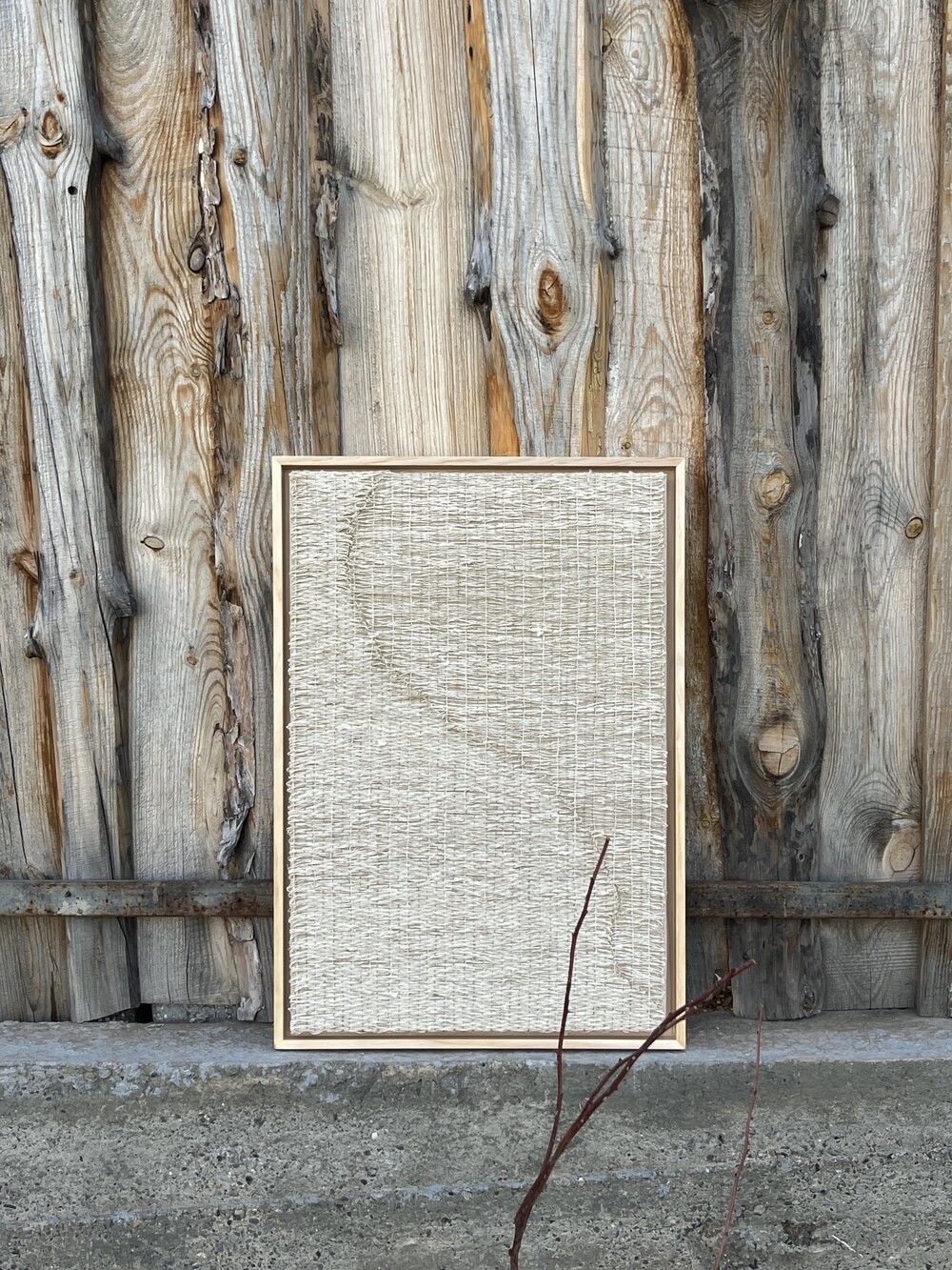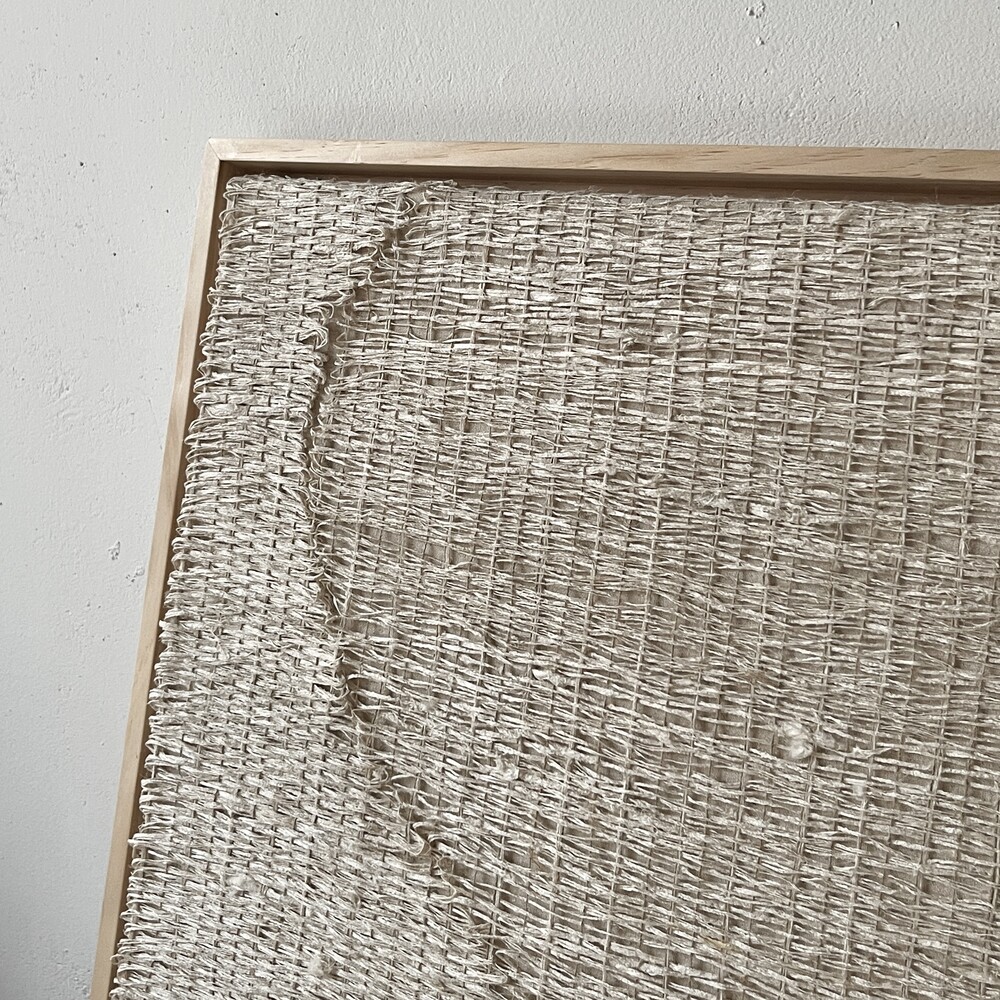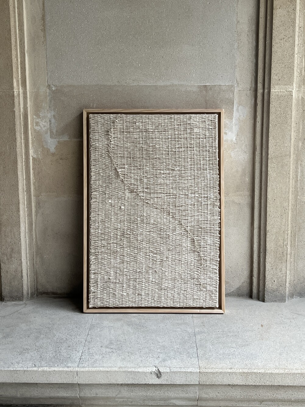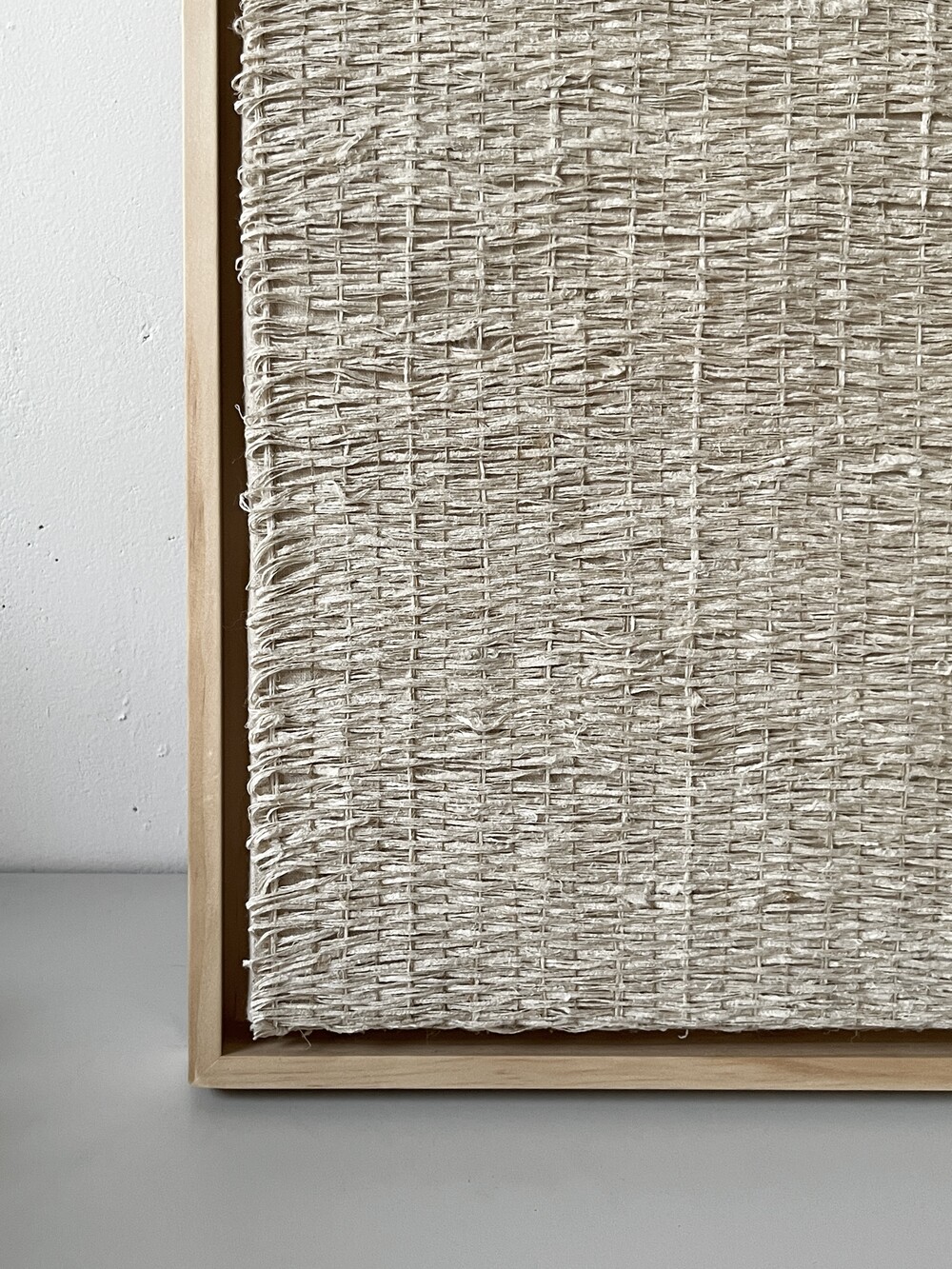 작업 과정 중, 선을 어떻게 표현할지에 대해 고민이 많았습니다. 여러 표현 방식을 시도했지만, 불필요한 요소들을 잘 덜어내어 간결하게 표현하는 것에 집중하였습니다. 작품을 볼 때 시선에 걸리는 부분이 없었으면 하여, 짜임의 밀도 차이로 자연스럽게 나뉘는 경계를 선으로 표현하였습니다. 빛과 각도에 따라 달라지는 선의 선명함과 텍스처의 깊이 또한 이 작업을 바라보는 또 하나의 요소가 되길 바랍니다.